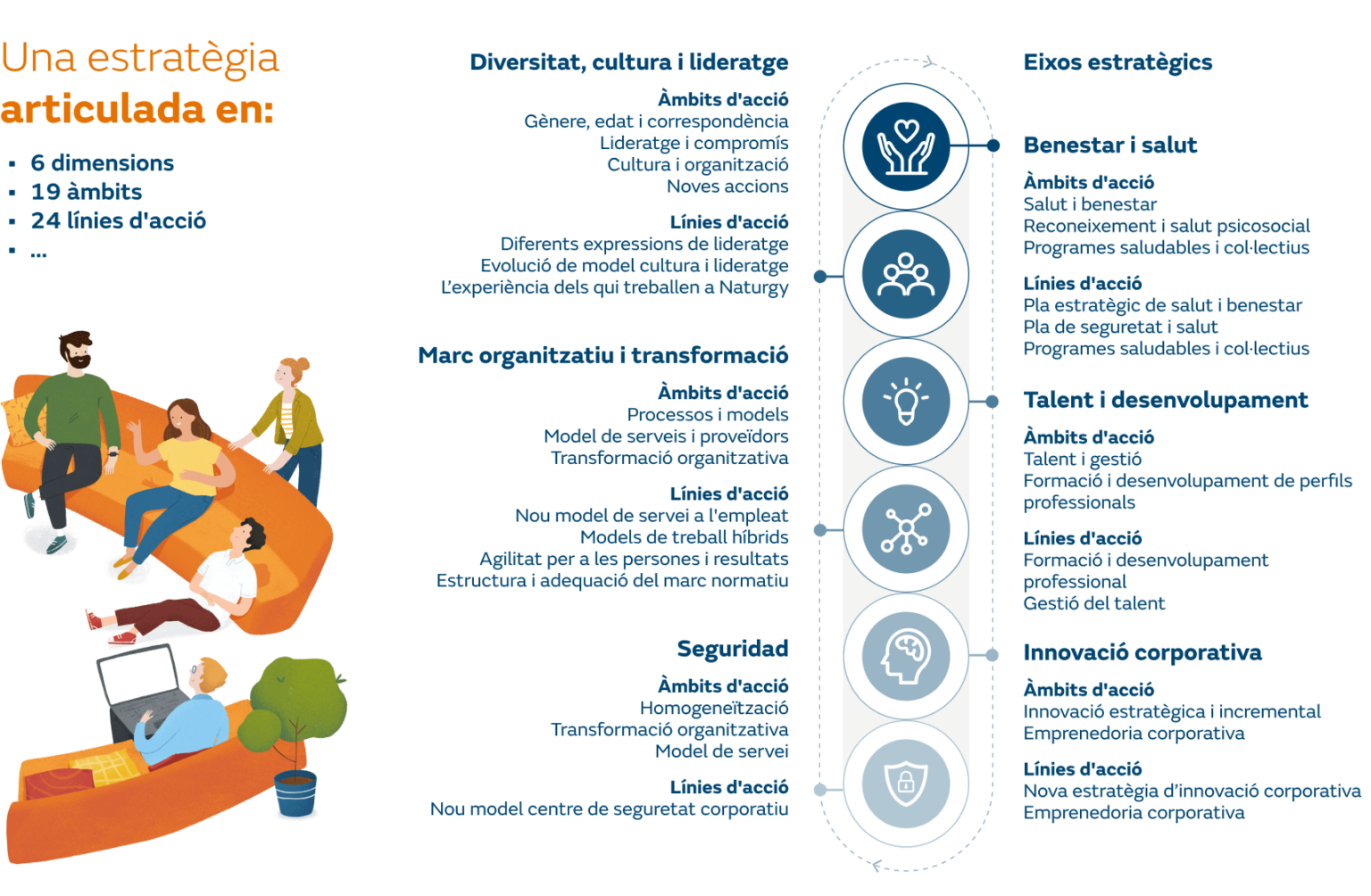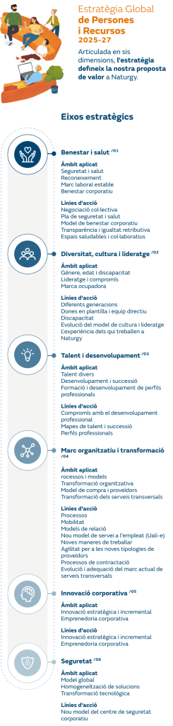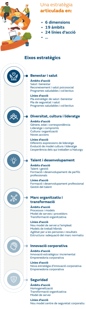 l’experiència professional de les persones, amb una visió compartida de futur a través de quatre eixos concrets: talent transformador i divers; experiència flexible de l’empleat; marc organitzatiu dinamitzador, i cultura Naturgy.