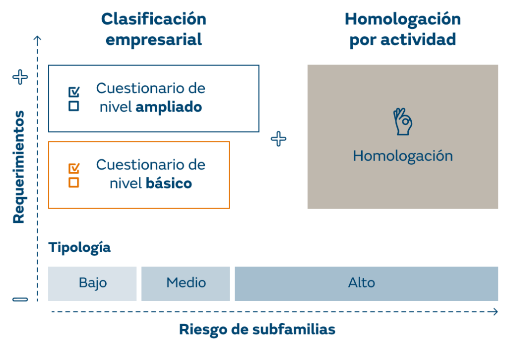 - Un nivel ampliado para proveedores de riesgo alto, que requiere adicionalmente un cuestionario ampliado y evidencias de información financiera, de sostenibilidad, de seguridad y salud y compliance.