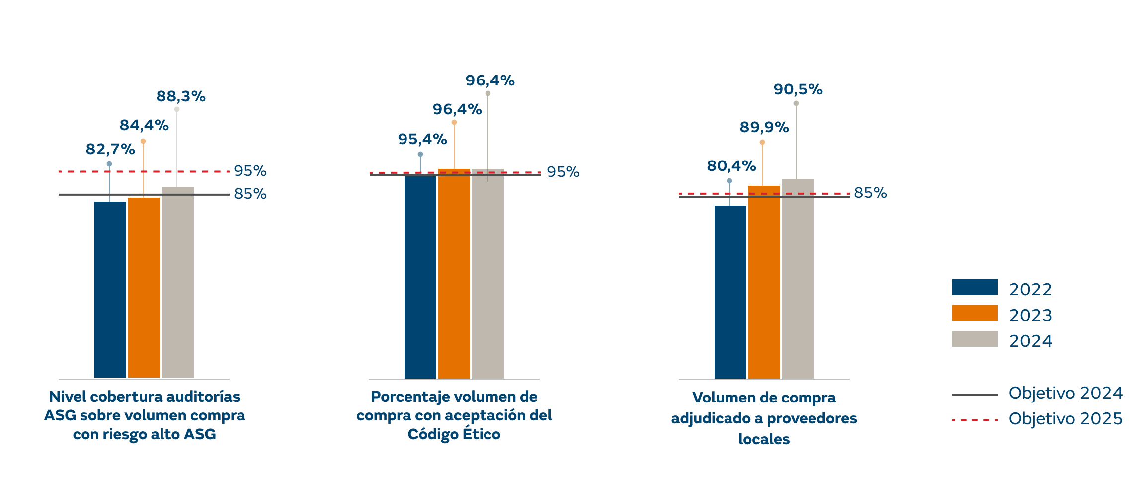 Promovemos la gestión de la cadena de suministro responsable, en especial, en las materias ambientales, sociales y de buen gobierno, garantizando, entre otros, el comportamiento ético y los derechos humanos y laborales, la transparencia, la oportunidad plena y justa, el respeto por los intereses de las partes interesadas, el respeto por el principio de legalidad y las normas internacionales de comportamiento, el enfoque a las necesidades, la integración y la mejora continua.