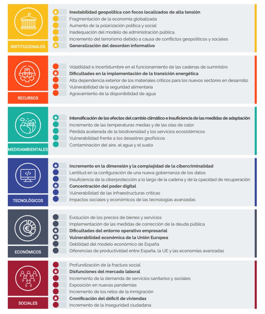 Se trata de la 4ª edición de este estudio, que en esta ocasión ha identificado 35 riesgos que representan en 2025 una amenaza para las organizaciones, y que se clasifican en 6 grupos por su naturaleza principal: institucionales, recursos, medioambientales, tecnológicos, económicos y sociales.