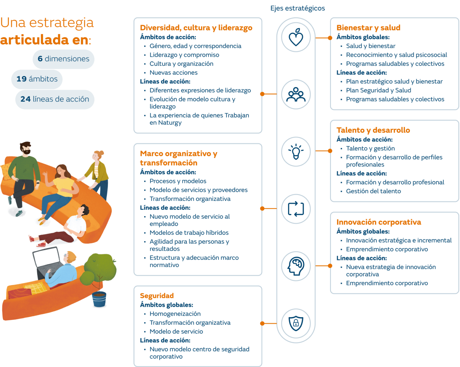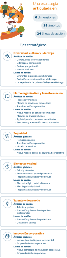 experiencia profesional das persoas, cunha visión compartida de futuro a través de catro eixes concretos: Talento transformador e diverso, Experiencia flexible do empregado, Marco organizativo dinamizador e Cultura Naturgy.