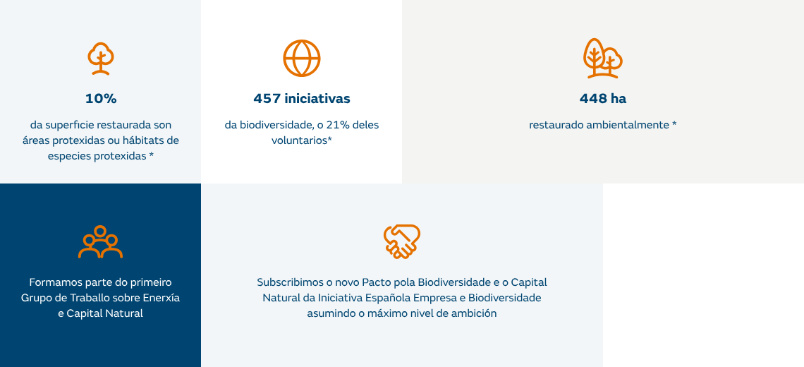 En 2013, asinamos o Pacto pola biodiversidade e desde entón participamos nesta iniciativa que coordina a Fundación Biodiversidade do Ministerio para a Transición Ecolóxica e o Reto Demográfico. En maio de 2023, subscribimos o novo Pacto pola Biodiversidade e o Capital Natural, asumindo o máximo nivel de ambición e apoiando así os obxectivos do Marco Mundial Kunming-Montreal da Diversidade Biolóxica. En concreto, comprometémonos a avaliar (identificar e difundir os impactos e dependencias da biodiversidade e o capital natural máis relevantes derivados da actividade da empresa), actuar (desenvolver e poñer en práctica unha folla de roteiro para diminuír os riscos e aproveitar as oportunidades) e divulgar os esforzos realizados e logros alcanzados en materia de conservación da biodiversidade.