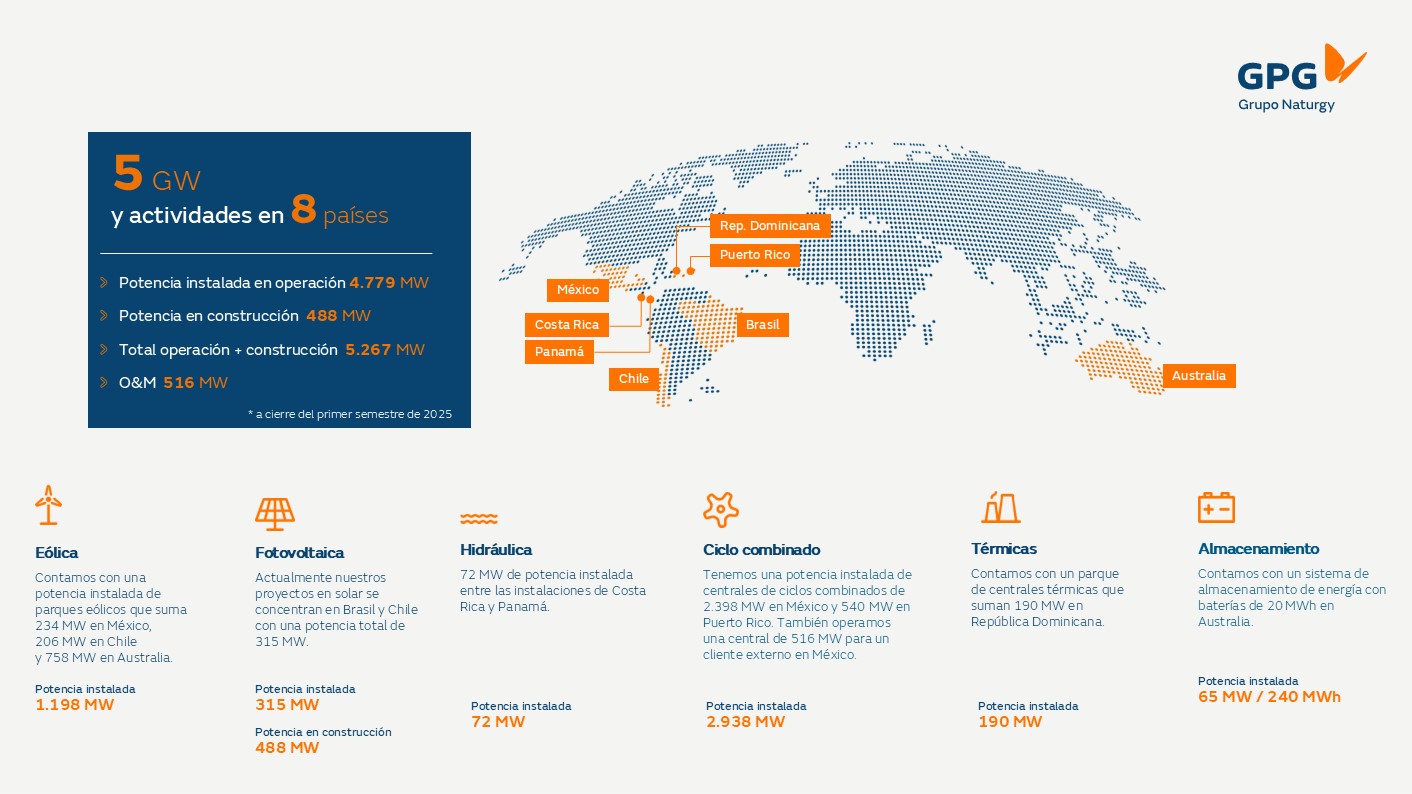 Global Power Generation (GPG) nació hace 10 años como una apuesta clara del grupo Naturgy para potenciar nuestro negocio de generación internacional, integrando en esta nueva empresa toda la cadena de valor de los proyectos de generación para convertirse en uno de los desarrolladores con mayor conocimiento de la industria, capaz de cumplir sus compromisos y operar sus activos de manera excelente.