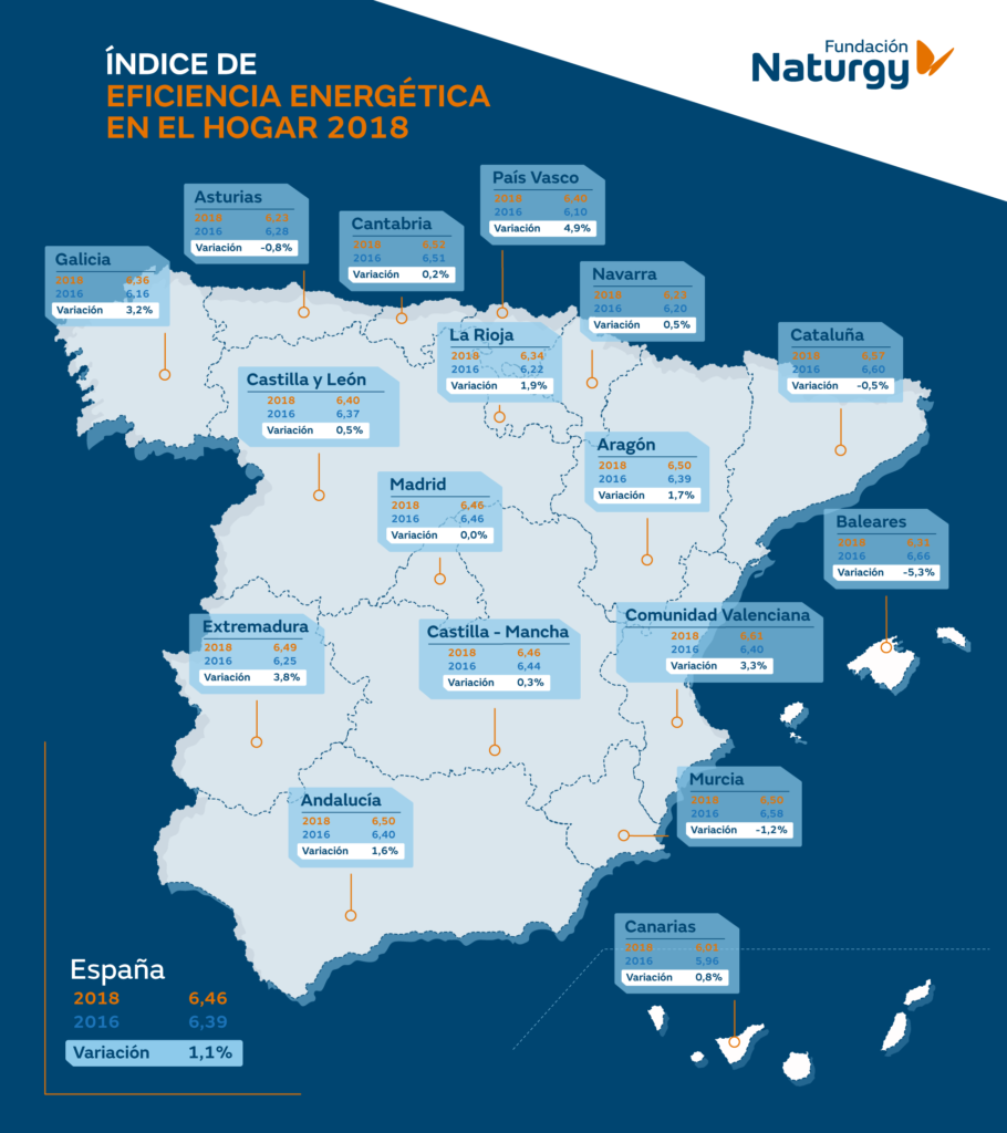 El estudio de la Fundación Naturgy contiene un Índice Global de Eficiencia Energética Nacional, que evalúa el equipamiento, control, mantenimiento y cultura de los hogares en una escala del 0 al 10. En esta edición, el índice se sitúa en 6,46 puntos, un 1,1% más que en la pasada edición. Es la primera vez desde 2011 que este indicador registra una mejora que, aunque ligera, es significativa por suponer un cambio de tendencia. Además, cabe destacar que el Índice de Eficiencia Energética ha experimentado un crecimiento del 5,73% desde la primera edición, en 2004, lo que refleja que los ciudadanos son cada vez más conscientes de las medidas de ahorro y eficiencia.