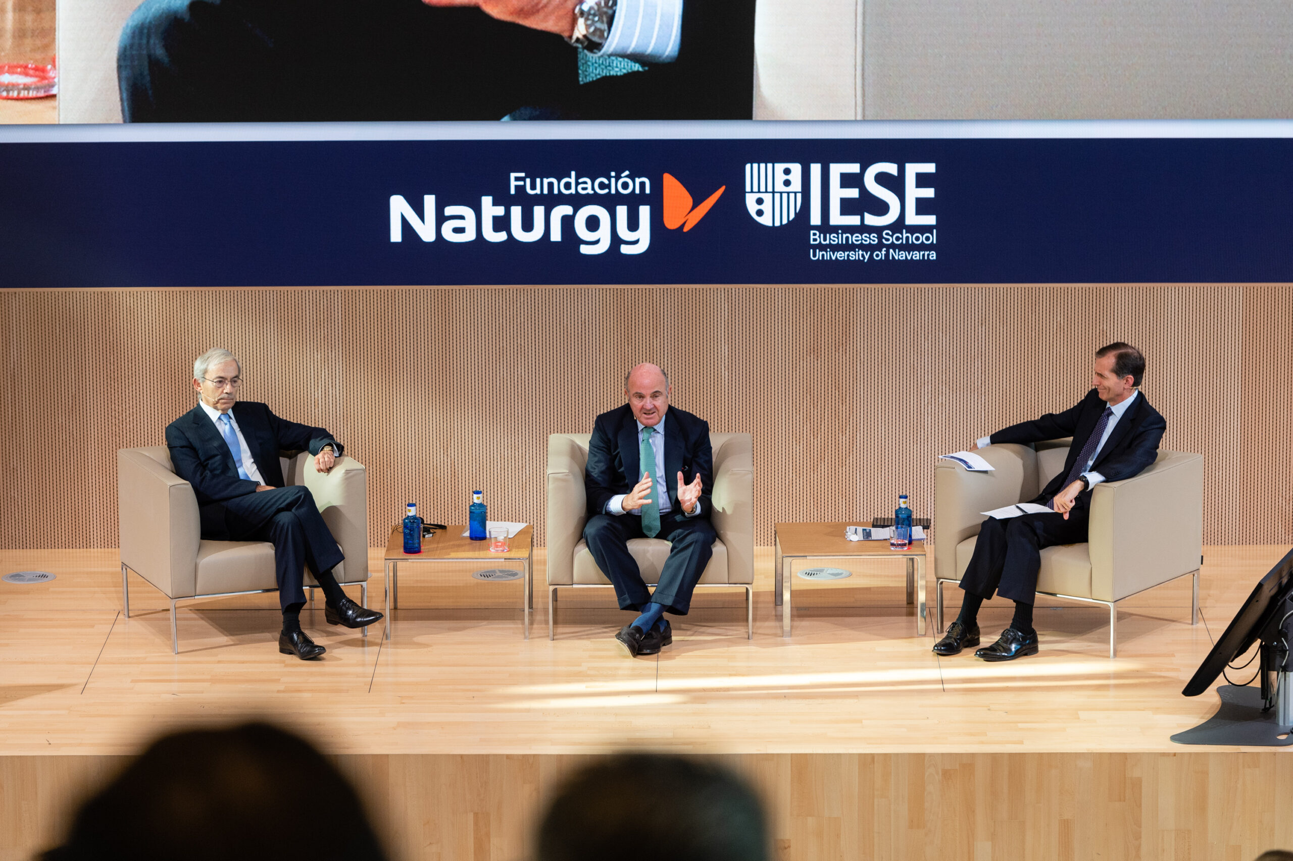 El vicepresidente del Banco Central Europeo, Luis de Guindos, y el Premio Nobel de Ciencias Económicas 2010 y profesor de la London School of Economics, Christopher Pissarides, participaron hoy en la undécima edición del ciclo de conferencias Energy Prospectives para analizar el impacto de la transición energética en el mercado laboral y en el actual contexto económico. El evento, organizado por Fundación Naturgy y el IESE Business School, fue inaugurado por el presidente de la Fundación Naturgy, Rafael Villaseca, y el director general del IESE, José Luis Suárez.