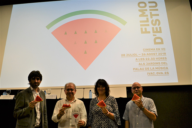 El director del Institut Valencià de Cultura (IVC), Abel Guarinos; el jefe de Programación de la Filmoteca, José Antonio Hurtado; el director adjunto de Audiovisuales y Cinematografía del IVC, José Luis Moreno y la directora general de NEDGIA Cegas, Celestina López han presentado esta mañana la programación de la XIX edición de la Filmoteca d’Estiu que se celebra en los Jardines del Palau de la Música del 28 de julio al 26 de agosto. NEDGIA Cegas patrocina esta iniciativa cultural por noveno año consecutivo, dentro del compromiso con el desarrollo cultural y social de la Comunidad Valenciana, en la que lleva más de 170 años prestando servicio.