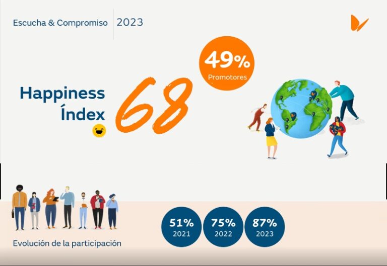 Con el objetivo de dar seguimiento de manera continuada a la experiencia del empleado, medimos y analizamos los diferentes factores que conforman la encuesta de clima y el nivel de Happiness Índex (HI), que mide el estado de ánimo de la compañía, segmentando la información para actuar de manera precisa sobre los diferentes colectivos y sus intereses.